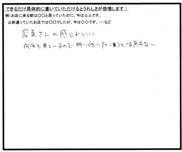何年も来ているので、特に他に行こうとは思わない・・・・(T.S様・40代・会社員)