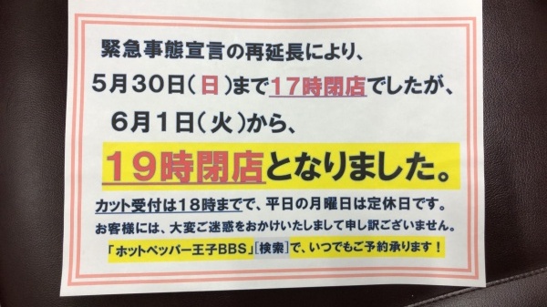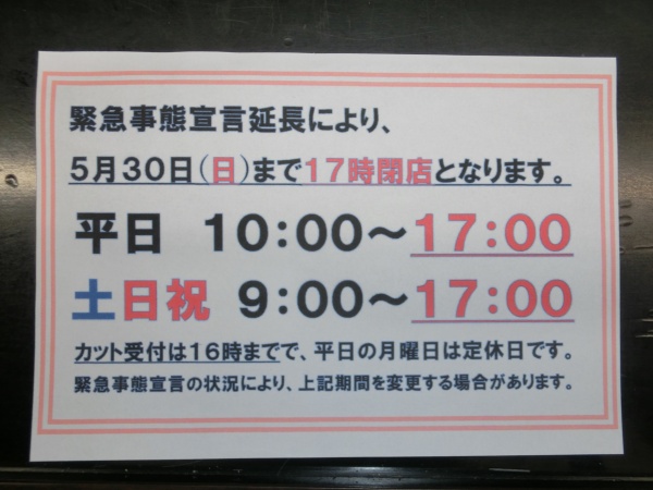 緊急事態宣言延長により、17時閉店を継続させていただきます。