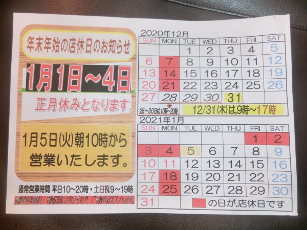 我々も気を引き締めて、年末年始を頑張りたいと思いますので、年末年始の店休日のご案内をいたしたいと思います。