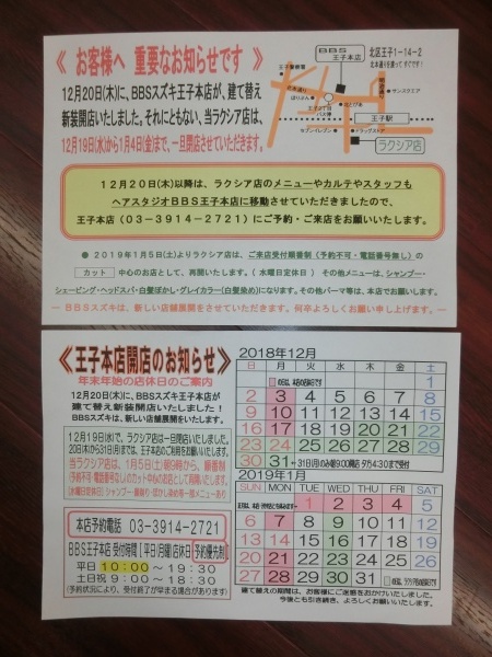 19日(水)まで、ラクシア店は営業いたしますが、19日(水)は、引っ越し作業のため、夕方5時で閉店させていただきます。20日(木)~1月4日(金)まで、ラクシア店は休業いたしますので、その期間は、王子本店にご予約の上、ご来店をお願いいたします。