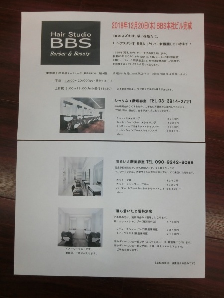 ●BBS王子本店1階は、予約優先制・イス5台の理容室。2階は、完全予約制のイス3台の美容室。平日AM10時~PM8時・土日祝AM9時~PM7時(受付は、閉店30分前(予約状況により、早めに受付終了になる場合があります))、平日月曜日定休日になります。一部施術料金も改定させていただきます。