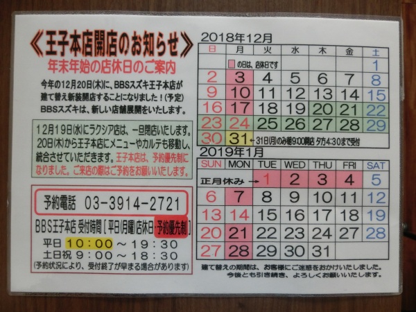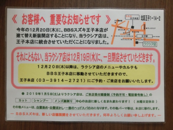●ラクシア店は、12月19日(水)で、一旦閉店いたします。20日(木)以降にご来店の方は、お手数ですが、王子本店にお電話予約の上、ご来店をお願いいたします。お客様カルテもスタッフも移動します。