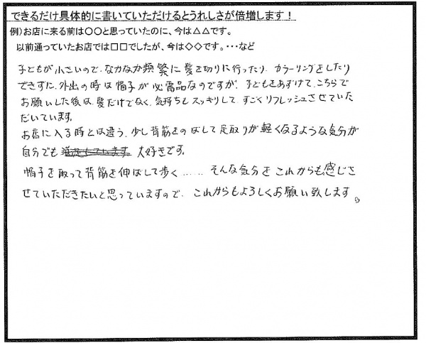 ☆子どもが小さいので、なかなか頻繁に髪を切りに行ったり、カラーリングをしたりできずに外出の時は帽子が必需品なのですが、子どもをあずけてこちらでお願いした後は髪だけでなく、気持ちもスッキリしてすごくリフレッシュさせていただいています。